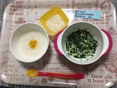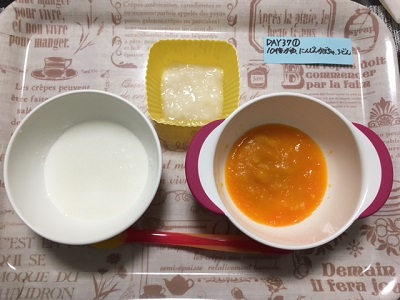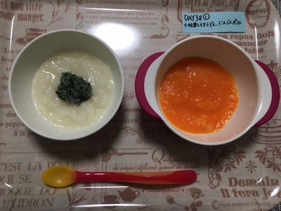 →フリージングしておいたおかゆを解凍し、適宜お湯を追加し柔らかさを調整する。にんじんも解凍し、おかゆにのせる。