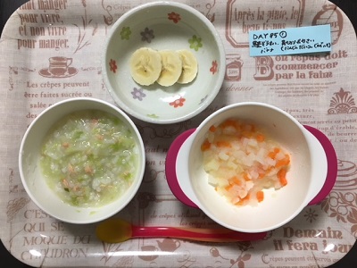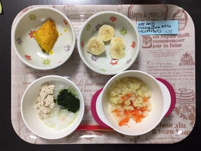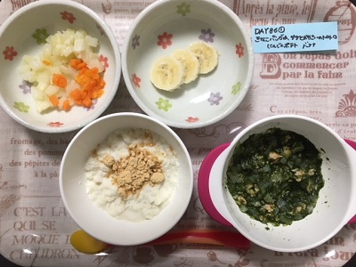 朝はパパが準備して、ゆめちゃんに食べさせてくれました。にんじんポテトキャベツは嫌いなものがないので大きなお口でパクパク。ササミほうれん草がゆは、手をおくちに入れたがって、ほうれん草の緑色が周りに飛び散り大変・・・ハイローチェアにバスタオルを敷いてガードしています。後半は眠くなったのか食べるペースが遅くなってきたので、伝家の宝刀「バナナと交互にだましだまし食べ」。ゆめちゃんバナナ大好きです^^かぼちゃは少しお湯で伸ばしてあげました。あまり好きじゃない感じかも?最近もそもそする食べ物は苦手な感じがします。