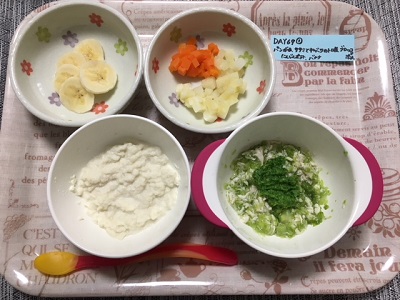 トマトは初挑戦。今まで、酸味がある食材は割といやがられたので、もしかすると食べてくれないかなと思いましたが、微妙な顔をしながらも完食。ひとまず食べはしてくれそうです。よかった~。