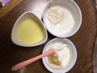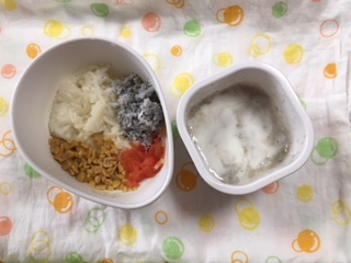 ちなみに、緑色は、本当はほうれん草を使う予定だったのに冷蔵庫にきらしていたので、たまたまあった大根の葉っぱでやってみましたが問題ありませんでした。ほかのも、ないときはベビーフード使ったり、その時ある野菜でできます。適当です。
