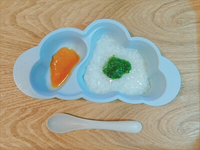 お魚入り10倍粥ほうれん草のせ、大さじ2杯