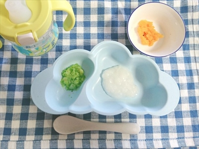 ほうれん草10倍粥、少し量を増やして大さじ1と1/2杯