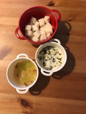 E:ヨコワ(刺身冷凍ストック)と茹でモロヘイヤ(冷凍ストック)、かつおだし(冷凍ストック)を容器に入れてレンジで加熱解凍する。大人用に茹でたそうめんの一部をさらに3分ほど茹でてカットして容器で合わせる。醤油2滴くらい入れる。