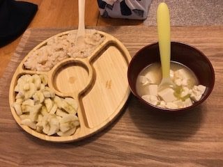 軟飯+七面鳥とジャガイモの煮込み(カナダの市販ベビーフード)