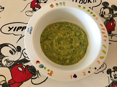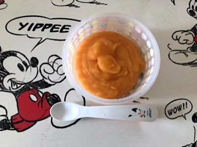 昨日、ズッキーニとひよこ豆のピュレのかわりにあげた人参とスイートポテトのピュレがまだあったのでそれをあげました。食べてる途中で何度か騒いだのですが、あやしながら食べさせて完食しました。