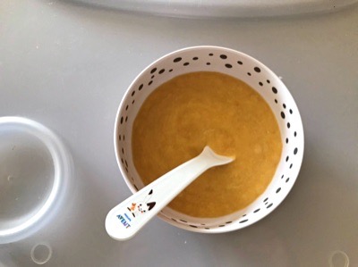 そのため、今日からペピートの離乳食にも茹で卵の黄身を少しずつ混ぜることにしました。にんじんと皮を剥いたズッキーニを柔らかくなるまで茹でて、余分な水分を捨てオリーブオイルを加えてハンドブレンダーでピュレにします。そこに、茹で卵の黄身を1/8くらい加えました。野菜のピュレを全て食べない可能性があったので、黄味は全体に混ぜずに、一部にだけ混ぜました。