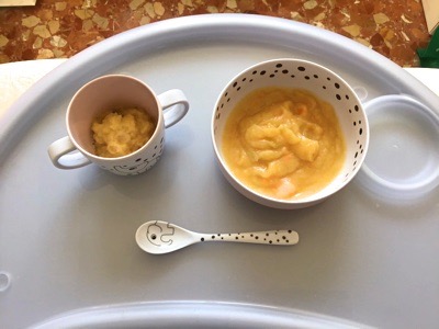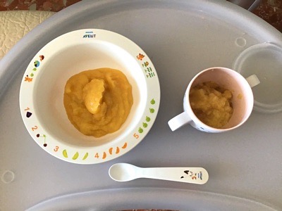 今日の野菜のピュレは撹拌が十分でなく、小さなかたまり少し残っていました。食べられるか分からなかったのですが、あげてみたら1〜2mm程度の大きさならもぐもぐして食べられました。野菜の大きめのかたまり以外はご機嫌で完食しました。なんでも口に入れて噛みたがるお年頃のペピート。食べている間も、自分のつけているプラスチックのエプロンを口に入れてカミカミしたり、スプーンを奪い取って口に入れてカミカミしています。そろそろ、野菜の食感を少し残したご飯をあげてもいい頃かもしれません。