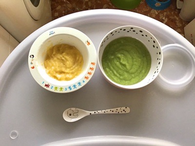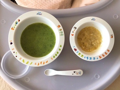 昨日のブロッコリーのピューレがとても水ぽかったため、今日は茹でたじゃがいもを昨日のブロッコリーのピューレに加えて一緒にハンドブレンダーで混ぜました。ちょうど良いとろみになりました。