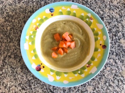 今日も昨日と同じメニューになりました。今日はどれだけのにんじんを食べるかと楽しみにしながら食べさせました。昨日と同様に、はじめはにんじんもピュレと混ぜればモグモグ食べていたのですが、半分くらい食べたところでぶーっと吹き出すようになりました。そのため、途中からはピュレだけを食べさせ、ピュレは完食しました。