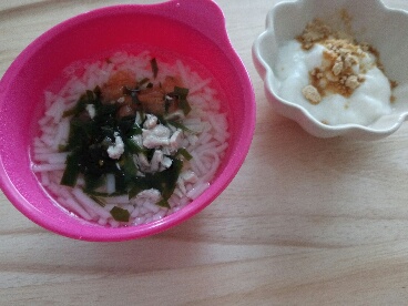 かつおは赤身魚で鉄分を多く含みます。鉄不足にさせたくないので、少しずつ鉄分豊富な食材を食べられるようにしてあげたいと思います。今回はにゅうめんの具として。