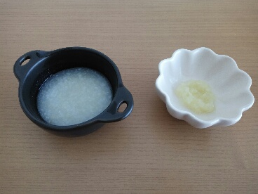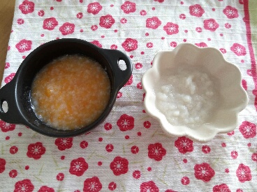 1.にんじんとおかゆの冷凍をそれぞれお皿に入れ、電子レンジで様子をみつつ温める。