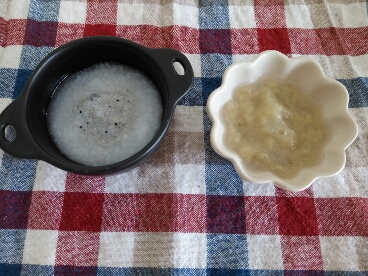 午後の食事では、おかゆとバナナを。これまた途中でぐずり、授乳したのですがパッチリしていたので、ダメ元で再度ごはんタイムに。するとご機嫌にパクパク食べてくれました。うれしいものの、授乳の量は足りてないということなのか・・・?と思うのでした。
