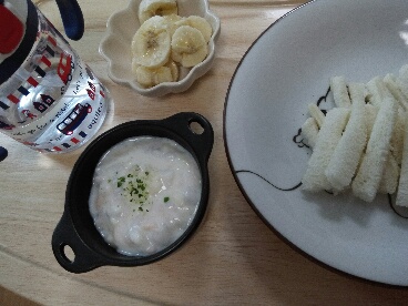 昼は先日も作ったトマトエッグ。トマト数切れと卵を混ぜて加熱するだけの簡単メニュー。思い付きで作ったものの、定番化しそうです。卵は固めだと食べにくいのか嫌がられるので、トマトの水分で柔らかく仕上がるのでこれはわりとスムーズに食べてくれます。そして簡単(重要!)。残った半分は私が食べますが、味付けしなくてもうまみがあっておいしいんですよ。おすすめです(*´ω`*)