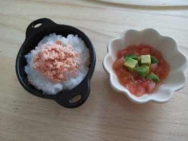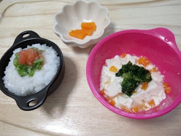 今日は少し夏っぽいメニューです。オクラはねばねばして食べやすそうだし、彩りもGOOD! つるむらさきは最近スーパーでみかけるようになったので挑戦。炒め物、お浸しなどとっても好きな食材です(*´ω`*) こちらも切るとねばねばするので、食べやすそうでしたよ。今日は豆腐に混ぜて食べさせました。