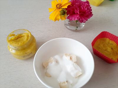 ⓵やわらかご飯にニンジン(冷凍ストック)と鶏胸肉のピューレ(冷凍ストック)を入れて電子レンジでチン。