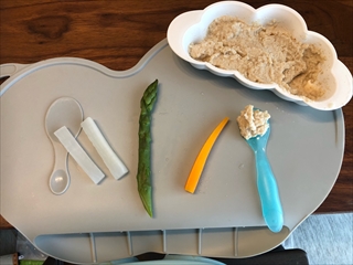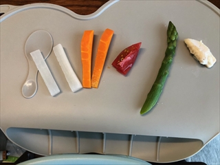 どんどんいろんな食べ物を与えていきます。アレルギーチェックも本場では赤ちゃんは能力により自分に必要なものを選ぶとしているのでアレルギーの物には手を出さないという考え方もあるようですが、卵とピーナッツは慎重に与えました。