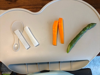でもBLWだと赤ちゃんが自分で食べてくれるので私は息子の目の前に座って息子が手に取ったものを「それはニンジンだねー。つかむのうまくなったね。パクっとしてみる?お母さんもニンジンたべよー」と息子に話しかけながら(独り言をいながら)食べています。