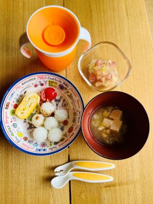 今まで手巻き状の海苔巻きを包丁で切る方法で作っていましたが、今回おにぎりボールに初挑戦です。おにぎりは手づかみで食べてくれましたね。おにぎりにすると、お茶碗に白ご飯をよそうより自分で食べてくれるから助かります。娘ちゃんレベルアップです。
