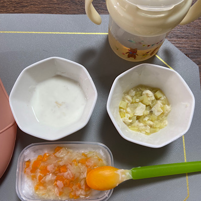 ツナと野菜のシチュー→野菜スープ(牛乳)を2つ(40g)とツナを2つ(10g)合わせてレンジでチンで完成!