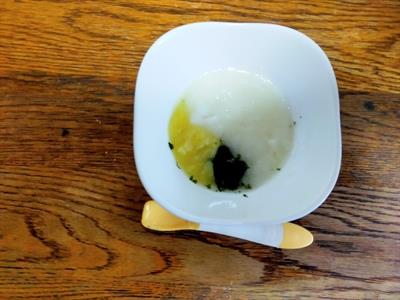 きな粉とおかゆとさつまいもを同じお皿に入れたので、みーに食べさせる時には混ぜてしまいます。きな粉単品だと、粉なので食べにくいですよね。