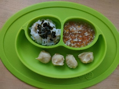 《オートミール粥/海苔のせ+にんじんと鶏むね肉のとろとろ煮+さつまいももち》