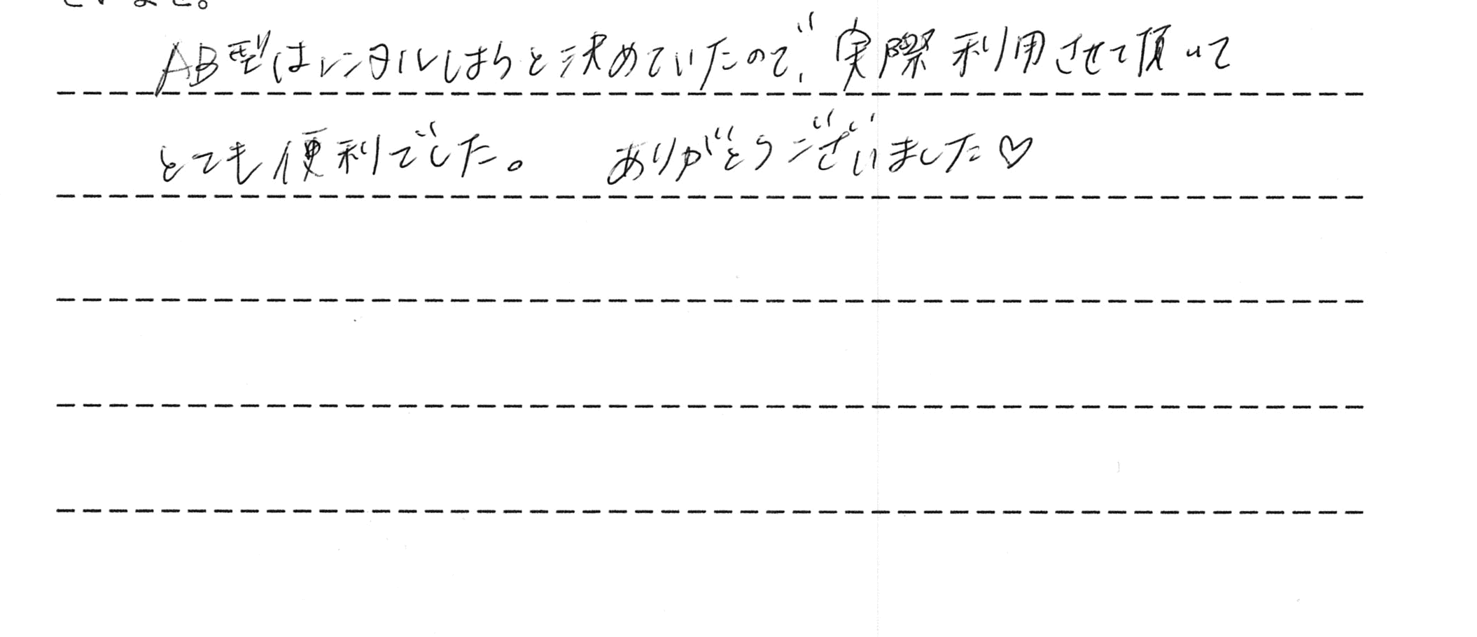 AB型ベビーカーは2台目のレンタルですが、使い勝手・デザイン共に良く、他の人にもオススメしたいものでした。ひざまでカバ-出来る日除けカバ-と、持ち手の部分の角度が調節出来るのが良かったです。おかげで、長男が妹のベビーカーを押すかわいらしい姿を見ることができました。