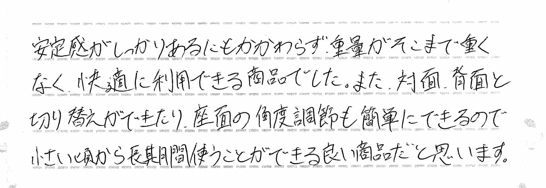 約4ヶ月間レンタルさせていただきありがとうございました。生後4ヶ月頃から使用しましたが、クッション性も高く安心して使用できました。また折りたたみもかなりらくで片手で出来るのはありがたかったです。(対面タイプで使用していた為、バーの向きを変えてからでないと折りたたむ事が出来ないのは若干不便でした:)軽く押しやすさはあったのですが段差には弱いようで、歩道の段差が多い都内での使用は大変でした。荷物入れの容量が大きかったのはとてもありがたかったです!!ありがとうございました!