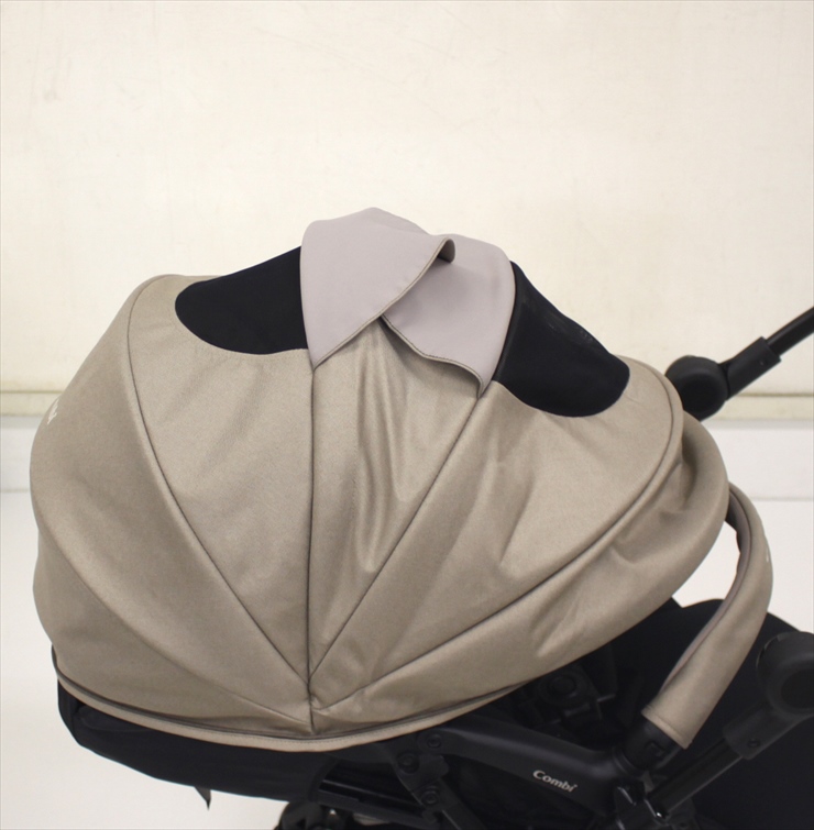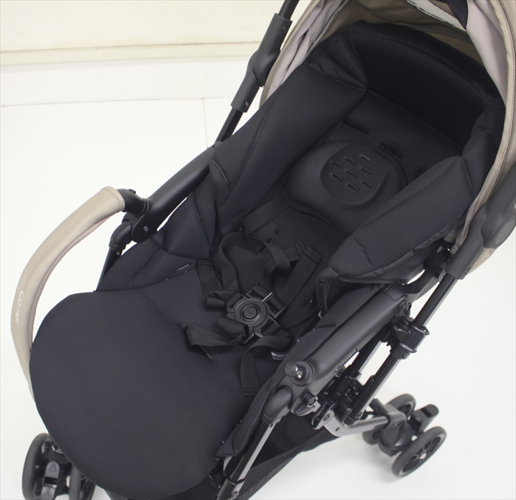 フレームのサイドにあるスイッチを上げるとハンドルがたためる新設計。ヘッドレストもたためてスッキリ高さ74cm。小さくたためてスッキリ収納できます。