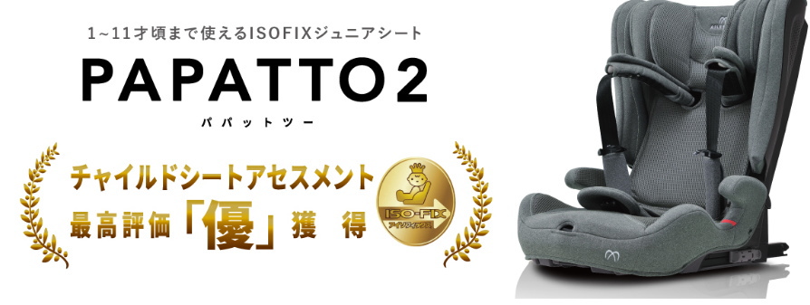 パパット2は1歳頃から11歳頃までお使いいただけるカーメイト製のISOFIX対応のジュニアシートです。「チャイルドシートモード」「ジュニアシートモード」「ブースターシートモード」と3つのモードが選べる3ステップシートで、お子さまの体格や使用シーンに合わせて使い分けることができます。ジュニアシートモードは、ISOFIXでの取付と車両シートベルトでの取付と両方が選べますので、ISOFIXの金具のない3列目の席などでも利用が可能になり便利です。スリムな形状ですが、頭部を守るヘッドクッションは3層になっており、横からの衝撃にも対応しています。ぜひレンタルでお試しくださいませ。