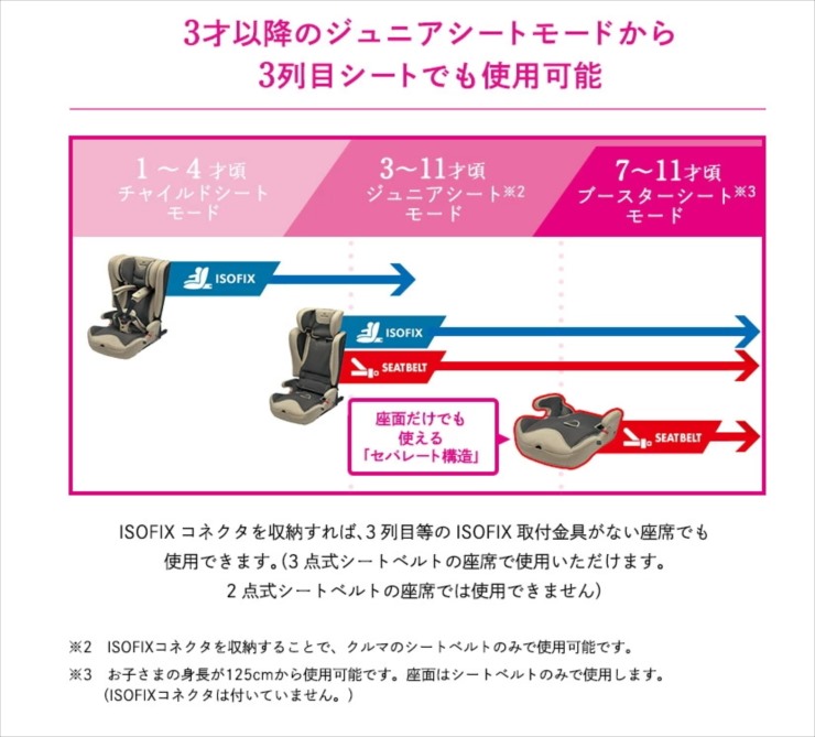 3歳以降はISOFIX金具のない3列目シート等(3点式シートベルトのみ)にも取付可能