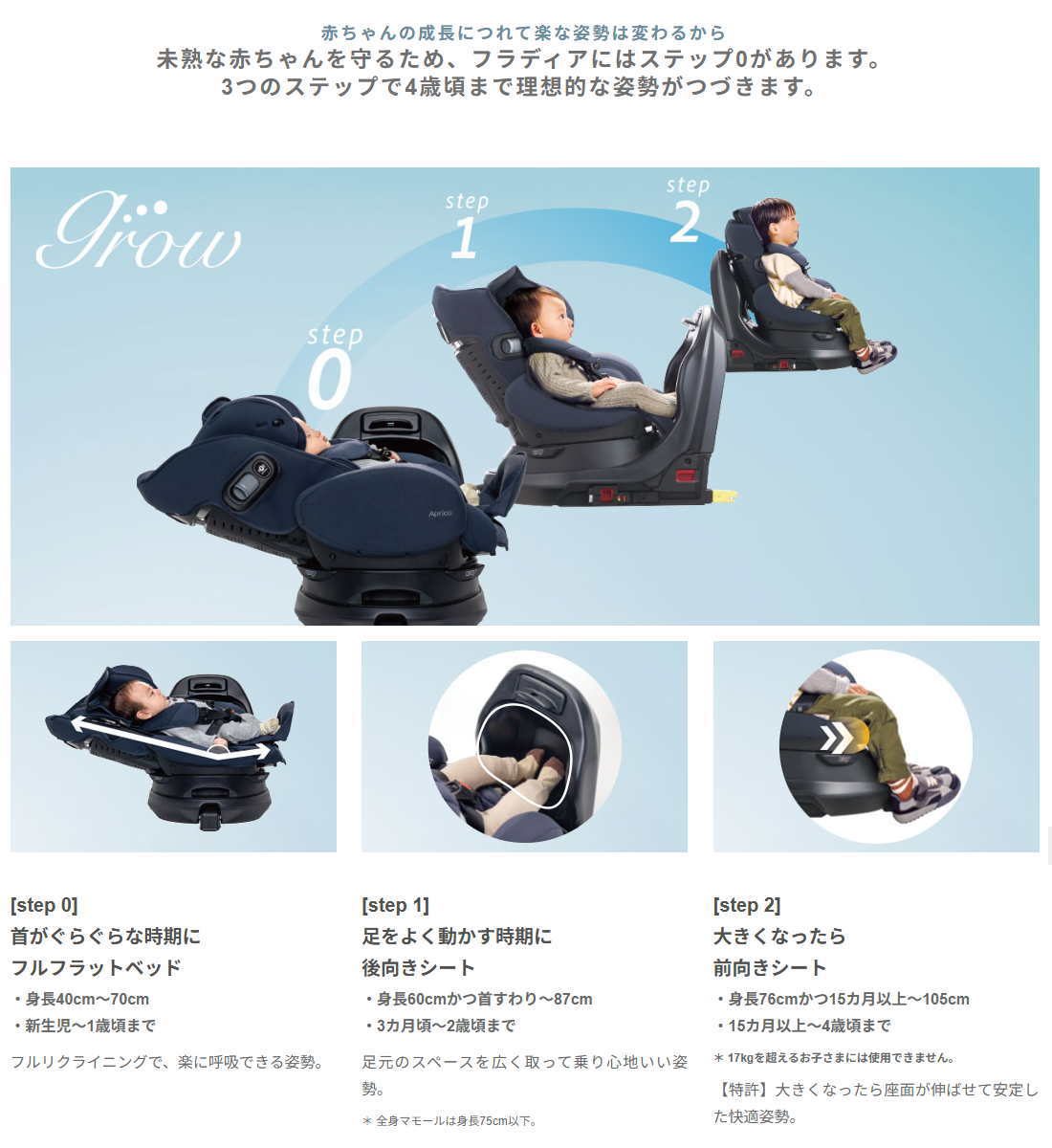 フルフラットベッドを「ステップ0」として、成長に合わせて「ステップ1」後向きシート、「ステップ2」前向きシートの3つのステップで、4歳頃まで理想的な姿勢をサポート