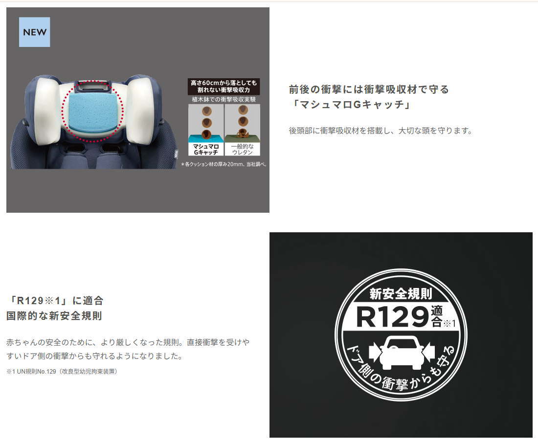 前後からだけでなく、ドア側からの衝撃も考慮した新安全規則R129に適合したチャイルドシートです。アップリカ独自の平らなベッドは、生まれたての赤ちゃん(身長70cm未満まで)をベッドで寝かせるようにまっすぐに寝かせてあげることができます。赤ちゃんを包み込む形状のインナークッション「全身マモール」と低反発ヘッドサポート、本体シート構造、両サイドのプロテクター「サイドシールド」で、赤ちゃんを全方位から保護します。