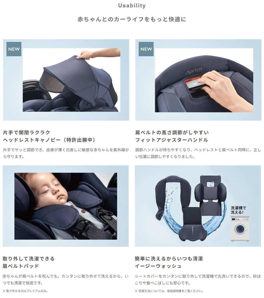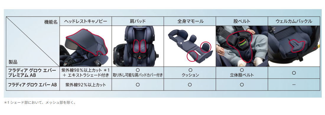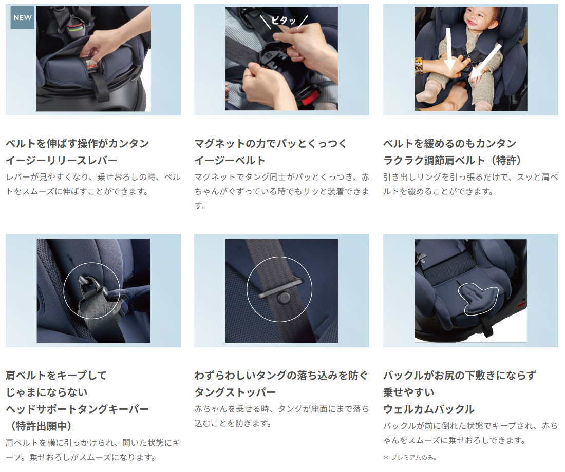 プレミアムモデルは、紫外線98%以上カット機能付きの生地を採用し、前方にエキストラシェードがついた大きなヘッドレストキャノピー(幌)や、 乗せ降ろしの時に、バックルがお尻の下敷きにならず乗せやすい「ウェルカムバックル」、肩パッドの上に取りはずして洗濯ができる「肩パッドカバー」が付いたりと、さらに使いやすい工夫が満載です。ぜひレンタルでお試しくださいませ。