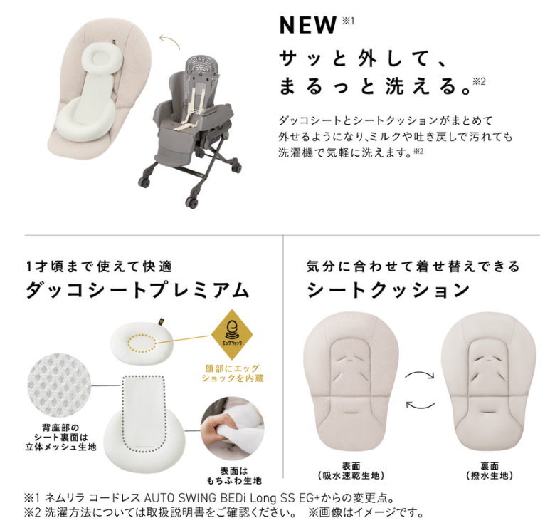 サッと外して洗えるシート:ダッコシートとシートクッションがまとめて外せるようになり、ミルクや吐き戻しで汚れても洗濯機で気軽に洗えます