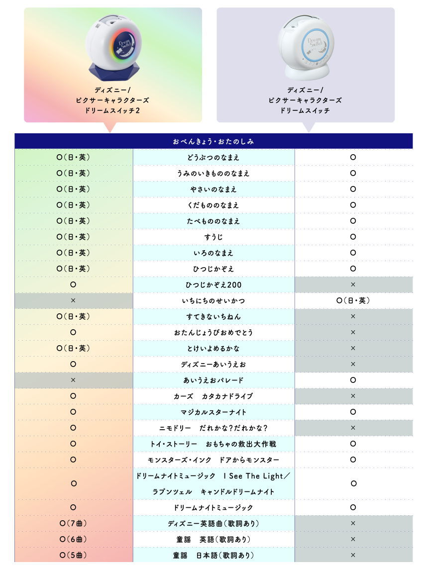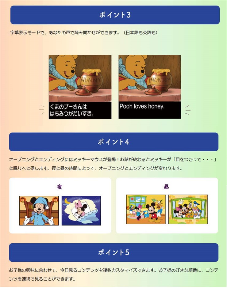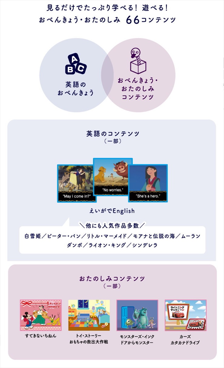 【おたのしみ 66種】ホールニューワールド、美女と野獣などディズニー英語曲7曲、映画のシーンで英語を学べるコンテンツ、ABC、あいうえお、時計の読み方、生活習慣など知育コンテンツ、ディズニーの星空やひつじかぞえなどの楽しいコンテンツ収録。(計600分以上)ご紹介ページ(メーカーのホームページ)
