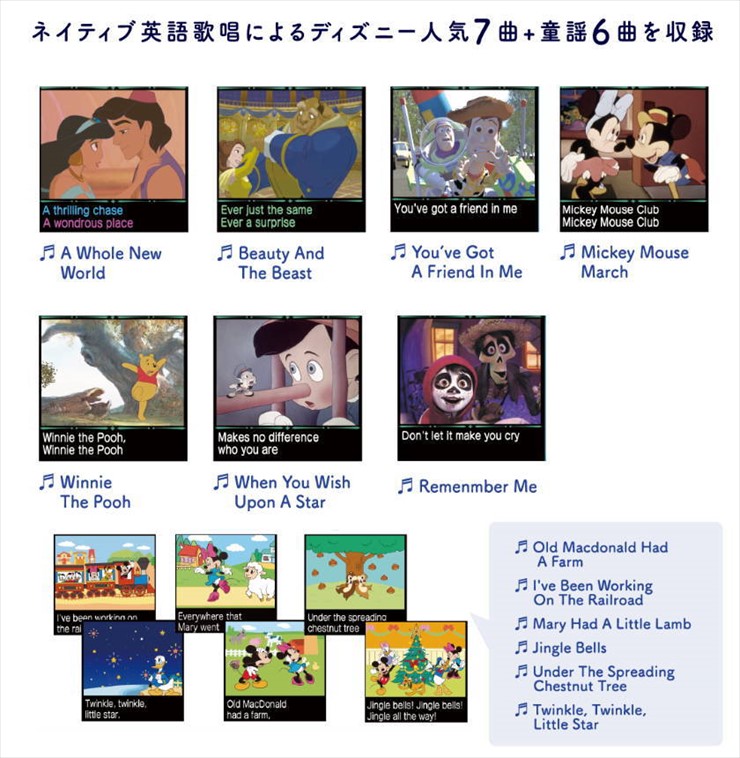 ディズニー絵本32話×日・英ナレーション、ディズニー英語曲を含むコンテンツがなんと130種も搭載