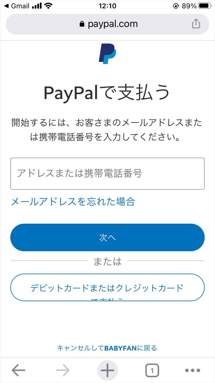 PAYPALアカウントからお支払いされる場合は、メールアドレスか携帯電話番号を入力して『次へ』のボタンをクリックしてください。