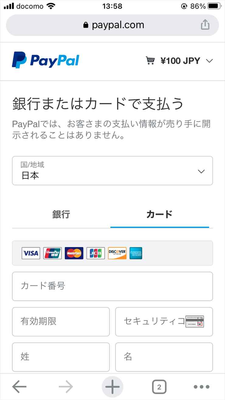 以下は、『デビットカードまたはクレジットカードで支払う』をクリックした場合の画面です。