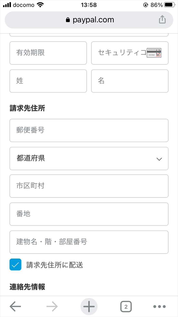 下にスクロールしていきますと、請求先住所の項目がございますので、お手数ですがこちらもご入力ください。請求先住所に配送のチェックボックスは、チェックが付いた状態で問題ございません。