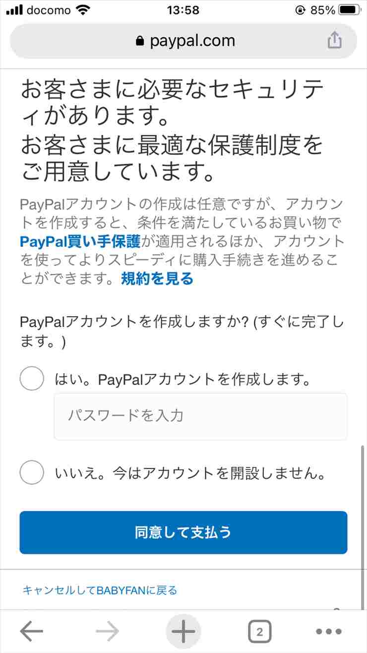さらに下にスクロールしていきますと、Paypalアカウントの作成の有無を問われますので、どちらはお選びいただき、『同意して支払う』をクリックしてください。
