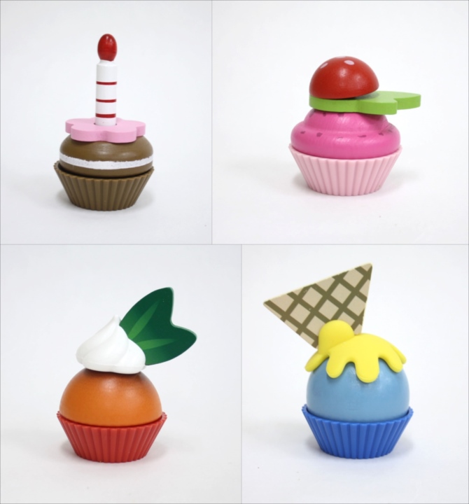 カップやスポンジやクリームなど、様々なパーツを組み合わせてカップケーキを作って遊べる積み木です。